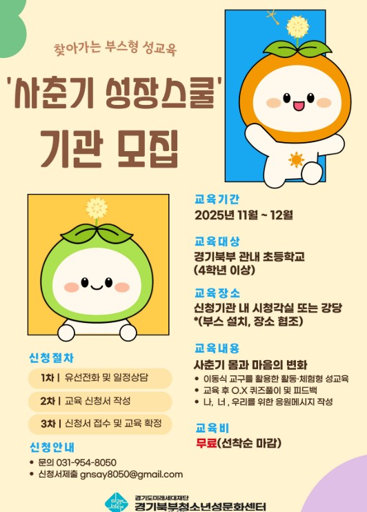 경기도에 따르면 2025년 10월 경기도미래세대재단에서 운영하는 경기북부청소년성문화센터가 초등학교 고학년 아동·청소년 대상 찾아가는 부스형 성교육 ‘사춘기 성장스쿨’ 프로그램에 참여할 교육기관 9곳을 선착순 모집한다고 한다.