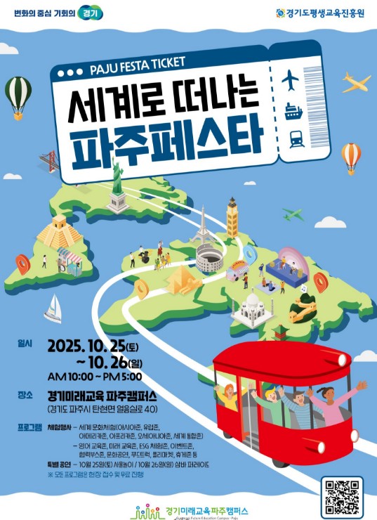 경기도에 따르면, 경기도가 주최하고 경기도평생교육진흥원이 주관하는 ‘세계로 떠나는 파주페스타’가 2025년 10월 25일과 26일 경기미래교육파주캠퍼스에서 열린다고 한다. 주말 이틀간 가족 단위 관람객이 세계 각국의 문화와 예술을 즐길 수 있는 체험형 축제다.